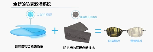 經(jīng)過特殊工藝,在鏡片的表面附上一層有防霧功能的膜,以達(dá)到防霧的目的,有效避免水霧凝集在鏡片表面。